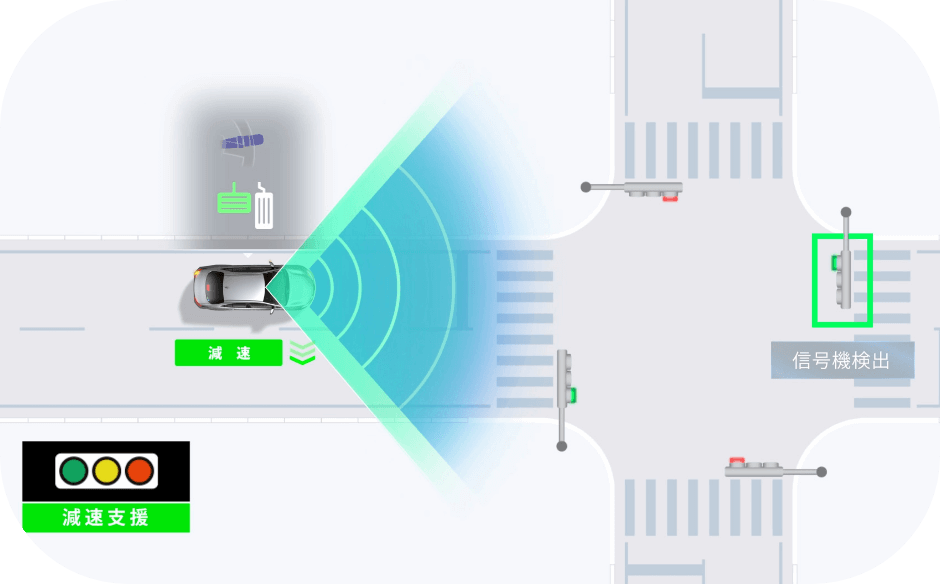 信号交差点への接近を検出した時、ドライバーのアクセルOFF、ウインカー操作に応じてあらかじめ減速を支援し、右左折時の操作余裕を確保します。
