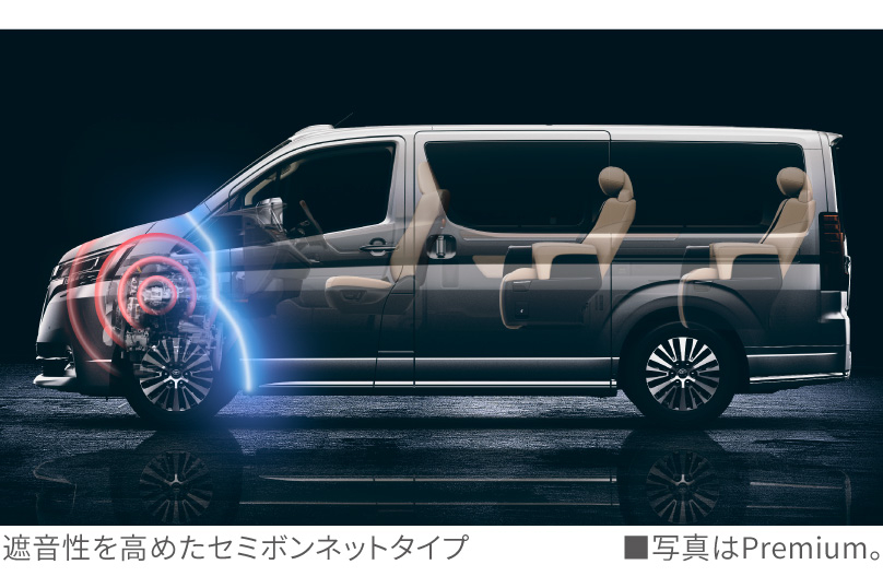 エンジンの搭載位置を室内空間から独立。エンジンルームと室内を隔てるダッシュパネルにはサンドイッチ鋼板を設定し、高い静粛性を確保しました。ホイールハウス内のフェンダーライナーやフロアなどには制振材を配置。さらに吸遮音材の最適配置と、ダッシュサイレンサーに高密度遮音層を採用、またスライドドアガラスを合わせガラス*にすることで、優れた遮音性を実現。エンジンノイズやロードノイズを低減した室内で、快適な時間をお過ごしいただけます。